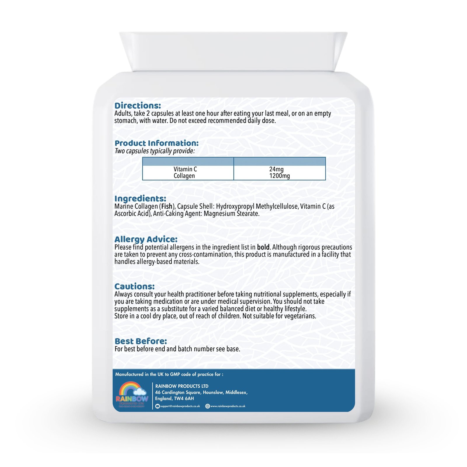 Marine Collagen (Fish), Capsule Shell (Hydroxypropyl Methylcellulose), Vitamin C (Ascorbic Acid), Magnesium Stearate (Anti-Caking Agent)