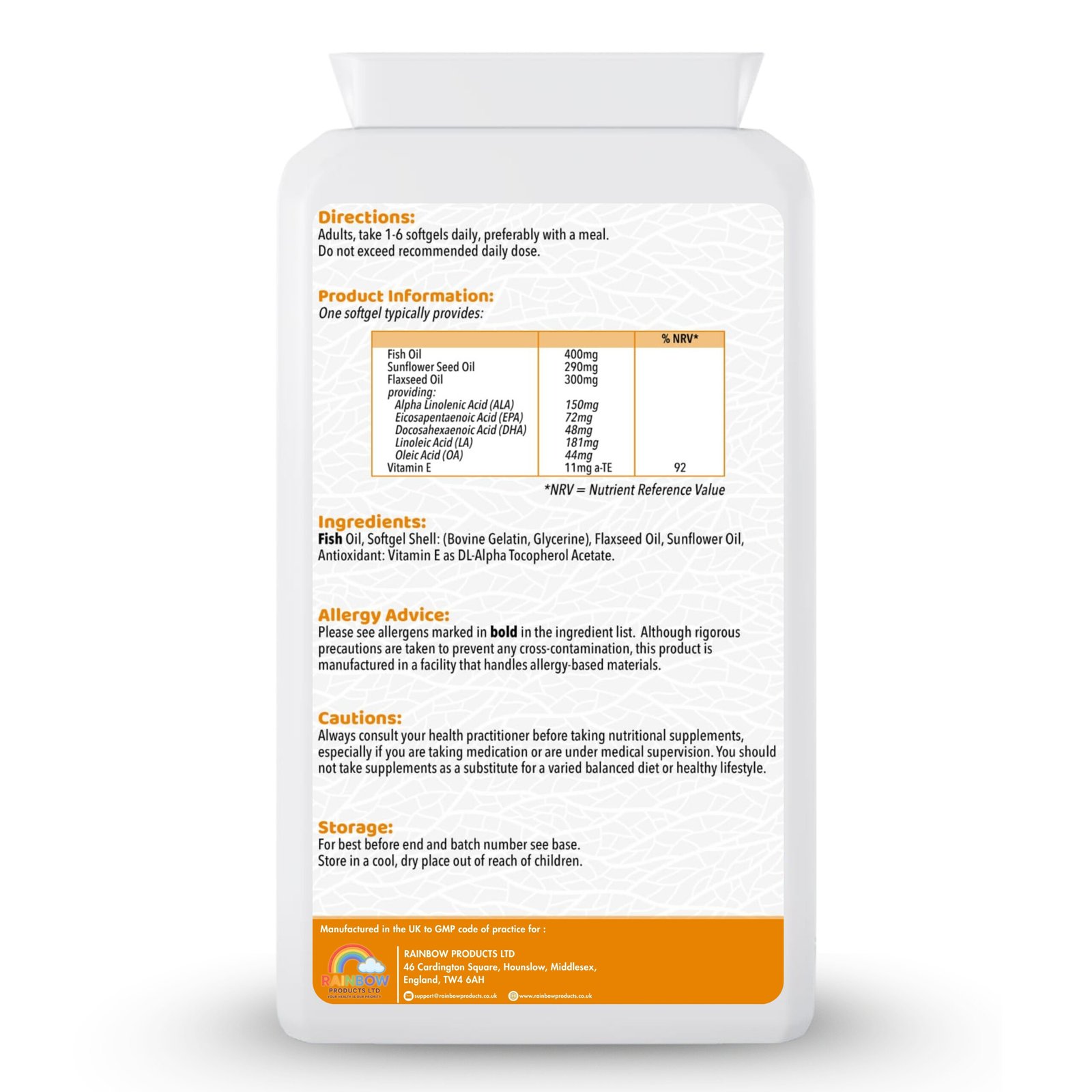Each softgel combines fish oil with sunflower seed oil and flaxseed oil, supplying a mix of Omega-3, Omega-6 and Omega-9 fatty acids. Vitamin E is included to help protect the oils from oxidation.